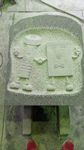 このキャラクターも、全身バランスから立体物で仕上げた場合自立させるのが難しく、かなり肉付けしたり大幅なデザイン変更を余儀なくされてしまうところ、レリーフ彫刻だとその心配は無用。